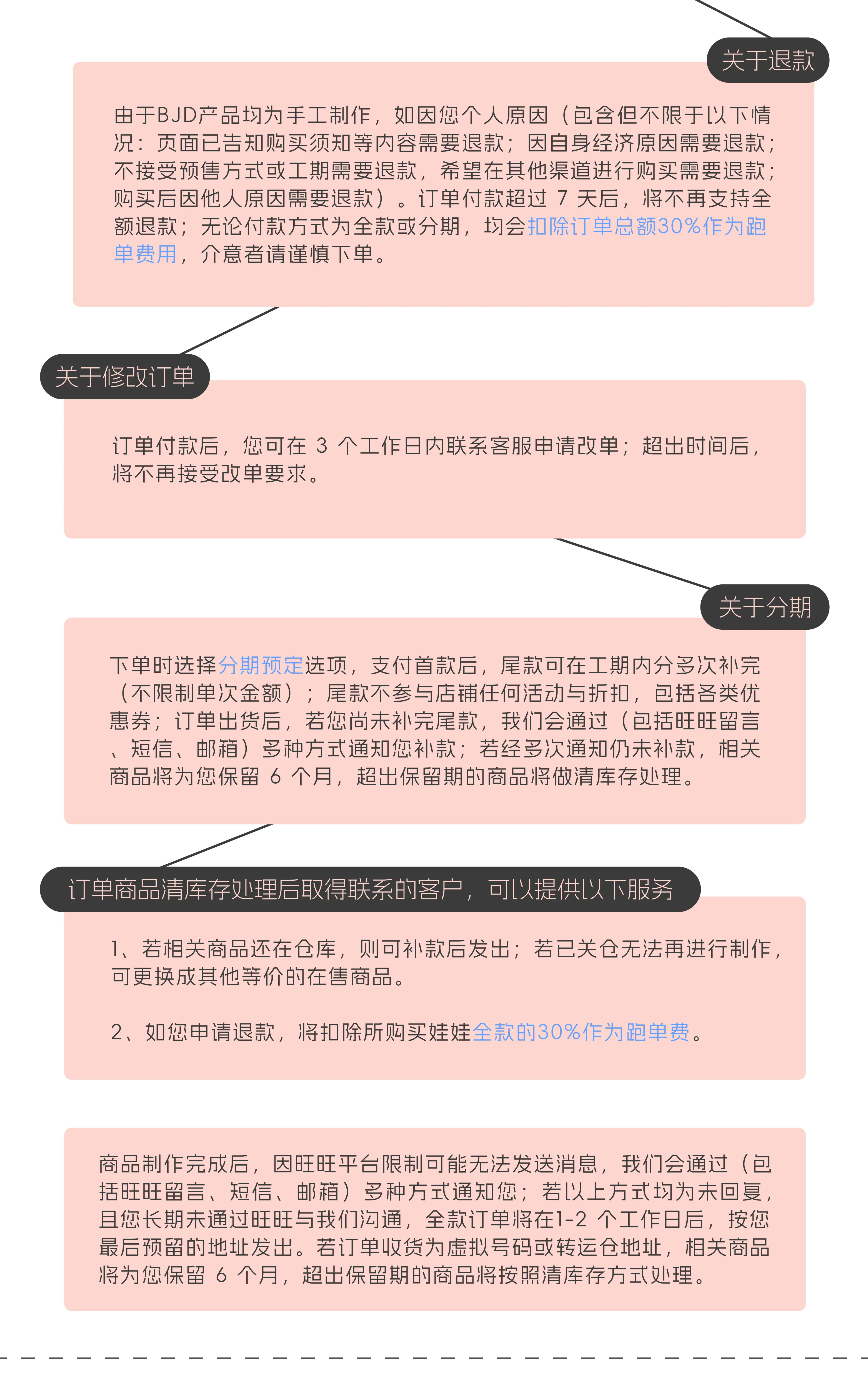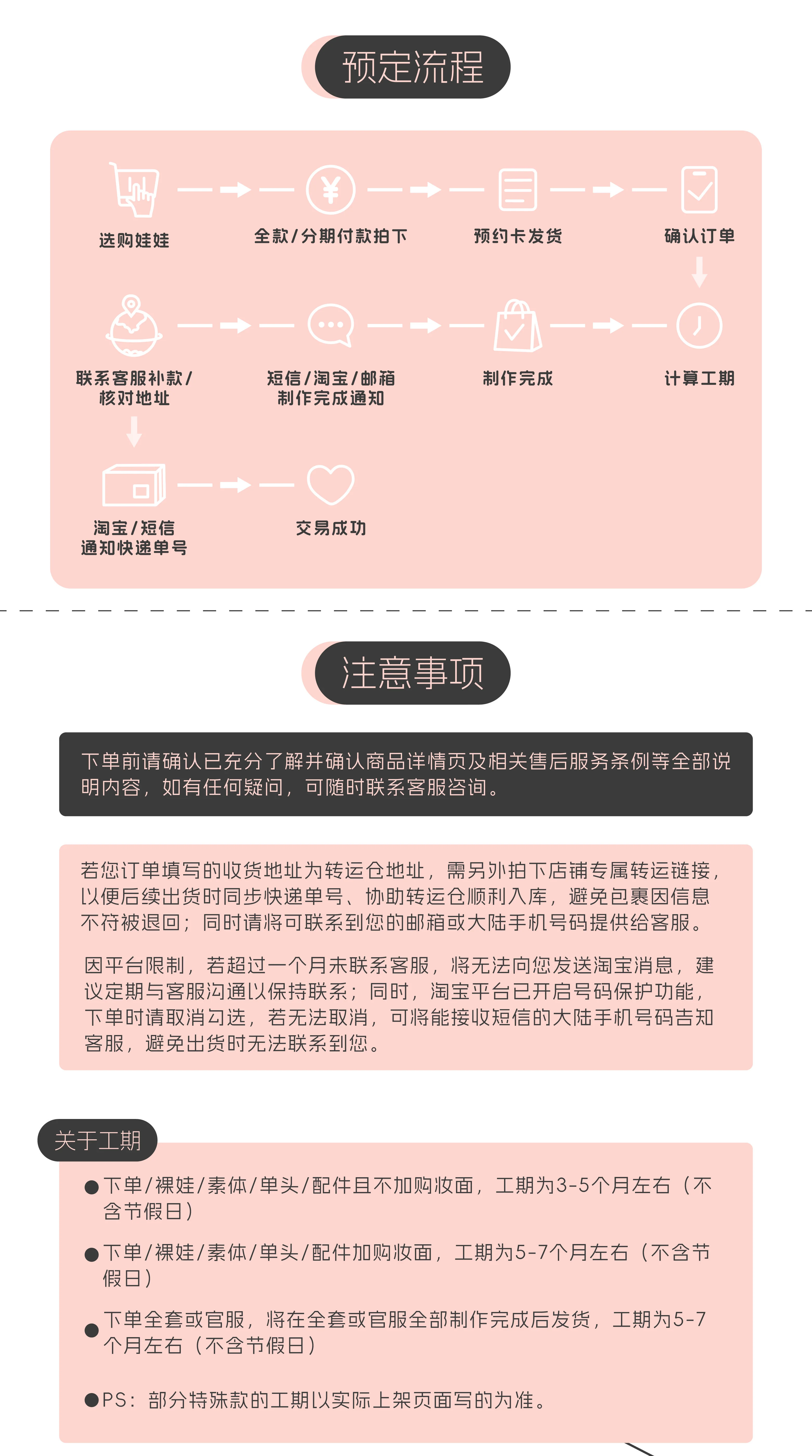 【预定流程】选购商品→全款/分期拍下并确认订单→计算制作工期→商品制作完成(多渠道通知)→联系客服补款/核对收货地址→预约卡发货→通知快递单号→交易成功。 【核心注意事项】1. 个人原因申请退款,付款超过7天需扣除订单总额30%作为跑单费;2. 订单付款后,3个工作日内可联系客服改单,超时不再支持;3. 分期尾款不参与任何店铺优惠活动,未按时补款的商品保留6个月,超时将做清库存处理;4. 收货地址为转运仓的,需拍下店铺专属转运链接,并向客服提供有效联系方式;5. 裸娃、素体等无妆产品工期3-5个月,加购妆面或全套商品工期5-7个月(均不含节假日),特殊款工期以商品页面标注为准;6. 下单前请仔细确认商品详情及售后条例,如有疑问可随时联系客服咨询。